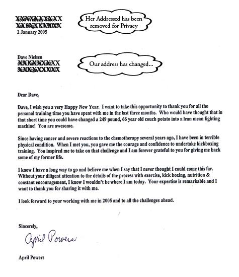 This Letter to REPUBLIC and Fitness Coach Dave Nielsen was from his 66 year old Boxing /Thai kickboxing/Fitness client April Powers who lost 80 lbs in 8 months with her REPUBLIC Fitness Program.